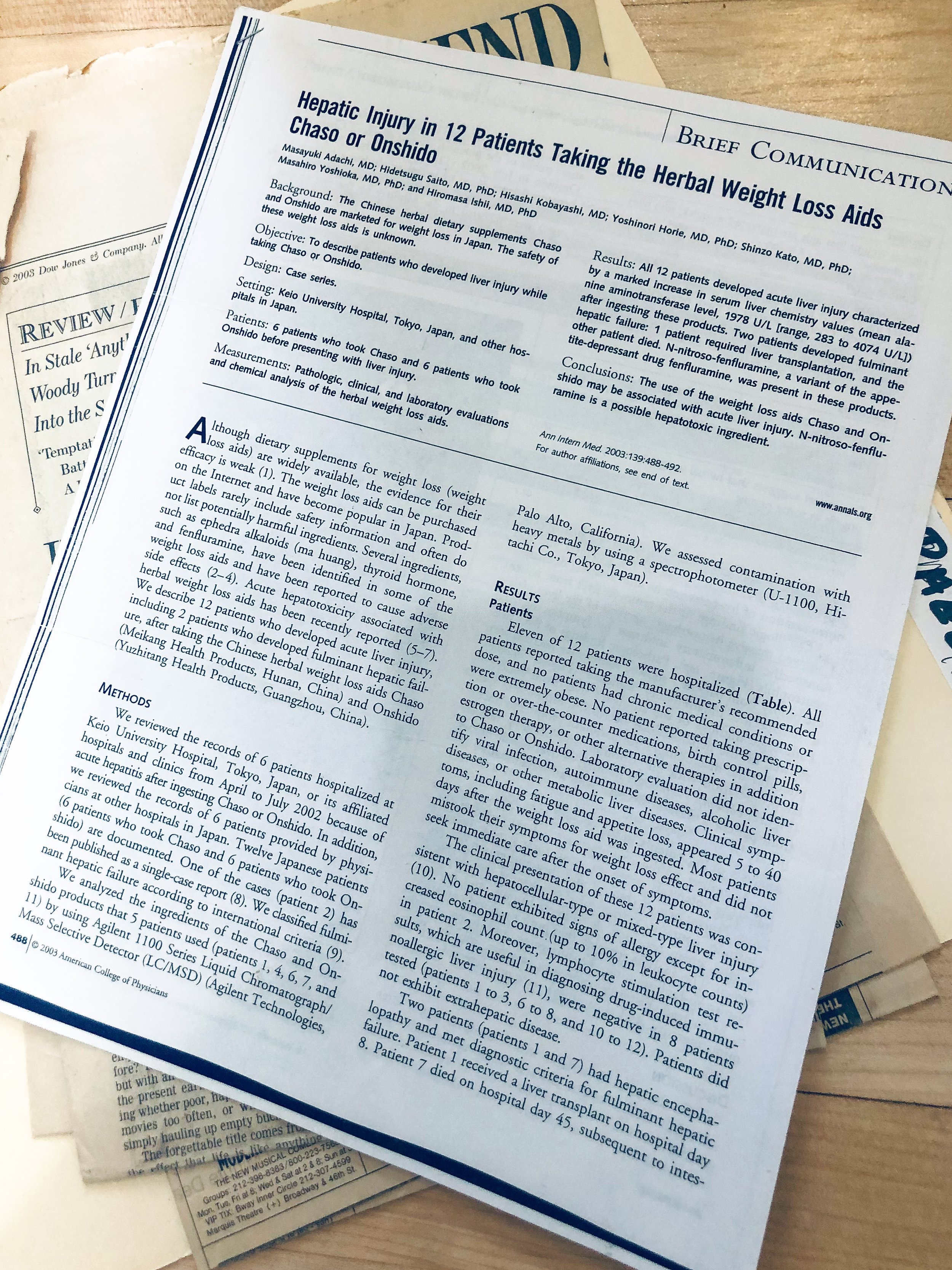 His name was Jimmy Schmids (I think). The scrawled note he sent me came stapled together with 3 pages. These were copies from the American College of Physicians titled Hepatic Injury in 12 Patients Taking Herbal Weight Loss Aids Chaso or Onshindo.