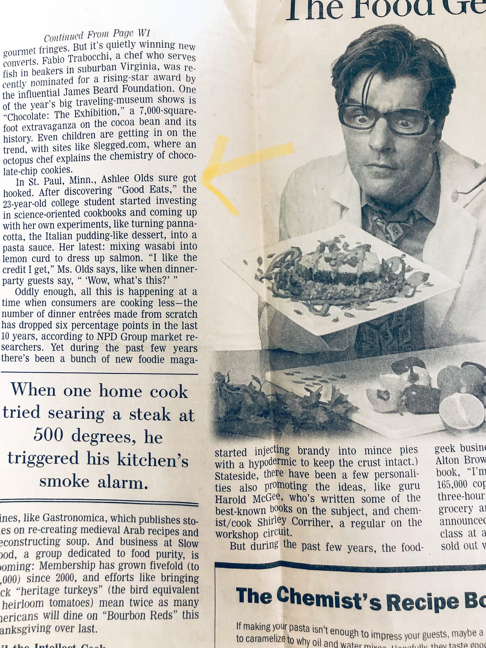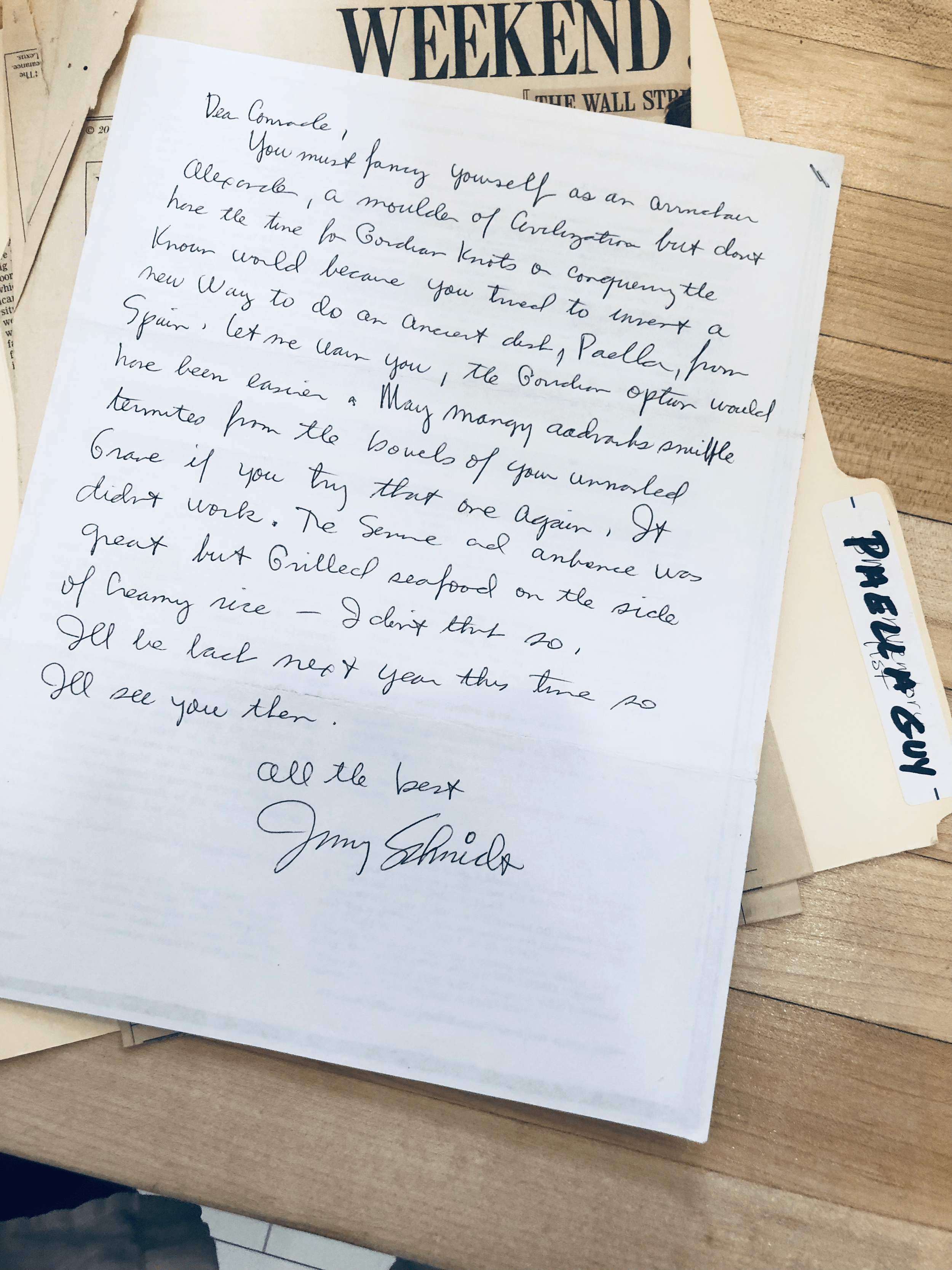 There were also several pages from the Wallstreet Journal Weekend in my envelope. The article I was supposed to read was titled The Food Geek, and he wrote Guess Who? next to the photo. But the article or anyone mentioned in the article was not written by or included a Jimmy Schnids.
