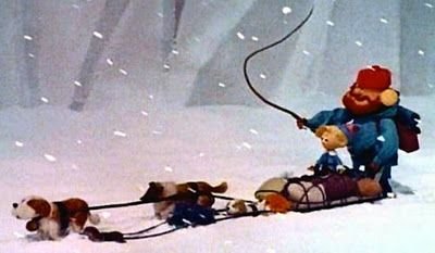 Yukon Cornelius is on the run from—or maybe to [not sure here]— The Abominable Snowman, and they all pile on the sled, loaded down with gunpowder, ham hocks, and guitar strings.