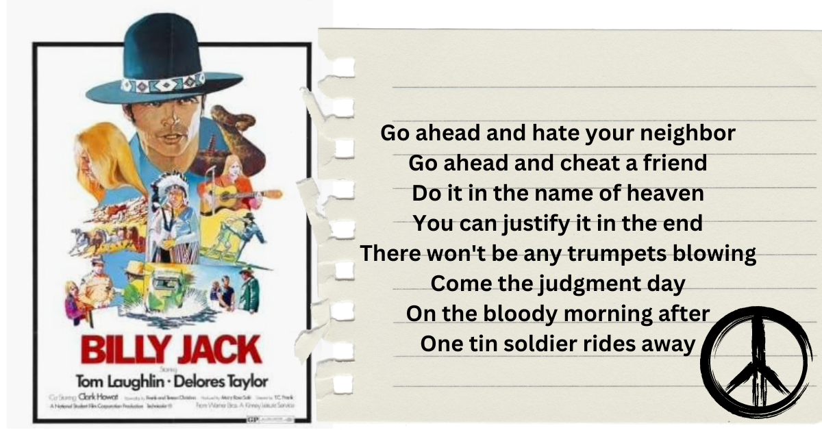 In May 1971, Billy Jack opened at Cinema 21 in the Northbrook Shopping Center. This theater was a beast—one massive screen. I researched, and it had five Voice of the Theatre speakers and a whopping 754 seats. I remember sporting my wide bell-bottoms and cropped shirt, feeling oh-so-radical as I set off to see this movie. This movie tackled some big issues and featured Tom Laughlin as an ex-Green Beret with a penchant for high-stepping karate kicks and evening the score in any way he could. Doing all that while preaching everyone should love their brother. Peace, Love and Billy Jack. That was 1971. It was a tad confusing. But to me what was most confusing was how that handsome guy in a cool hat had such an old girlfriend. The movie’s song, “One Tin Soldier,” became an anthem for everyone. My friends and I took it to heart, memorized all the words, and I put it in my 7th-grade spiral notebook. The one with the peace sign was erased in the front cover. We held our fists in the air and sang the chorus for months. We were rebelling, though we didn’t know what against. We just loved the song!